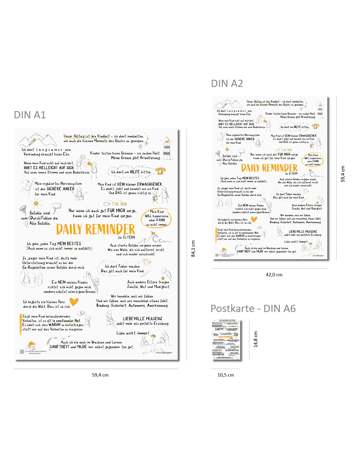 Manchmal ist alles viel: Tränen, Wut, Müdigkeit, To-dos. Genau dann hilft dir dieses Poster, vom Reagieren ins Verbinden zu kommen. Der „Daily Reminder“ schenkt dir kurze, liebevolle Impulse – ohne Zeigefinger – und bringt dich in herausfordernden Momenten zurück zu Gelassenheit, Orientierung und Bindung.