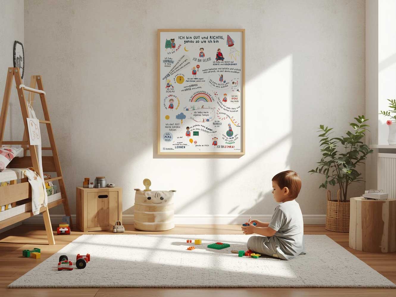 Unser Kinder Affirmationsposter "Ich bin GUT und RICHTIG, genau so wie ich bin" soll mit vielen bestärkenden Wahrheiten Kinder dabei unterstützen, innere Stärke und Widerstandsfähigkeit zu entwickeln und ihren eigenen Weg zu gehen. Als besonders schöner Blickfänger mit hervorragender Lesbarkeit schon ab dem Grundschulalter sorgt es jeden Tag aufs Neue für positiven Zuspruch - ob im Kinderzimmer, Kindergarten oder Klassenzimmer oder einfach als einzigartiges Geschenk zum Schulanfang, zum Kindergeburtstag, zum Namenstag, zu Weihnachten, zu Ostern, zum Kindertag, und...und... und...