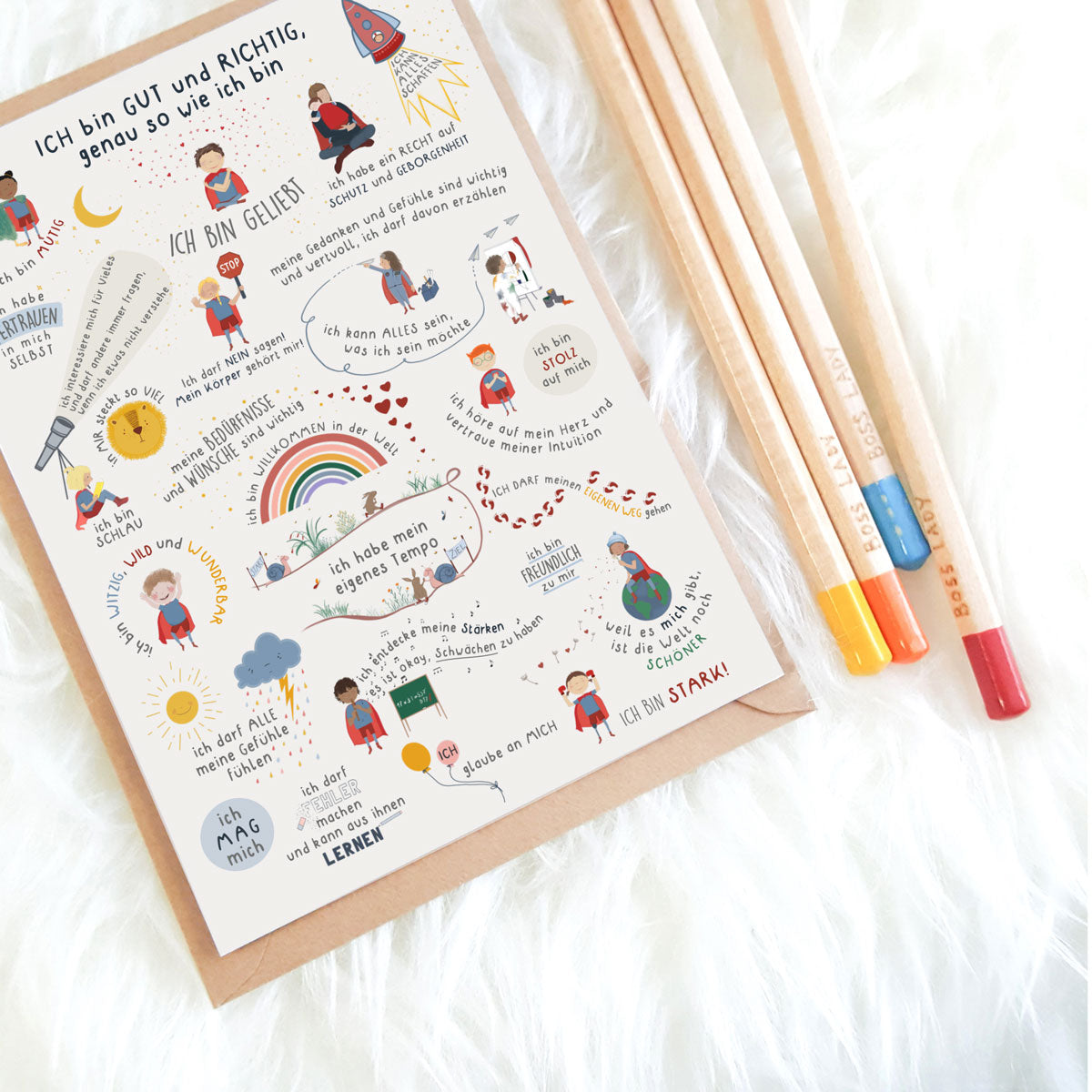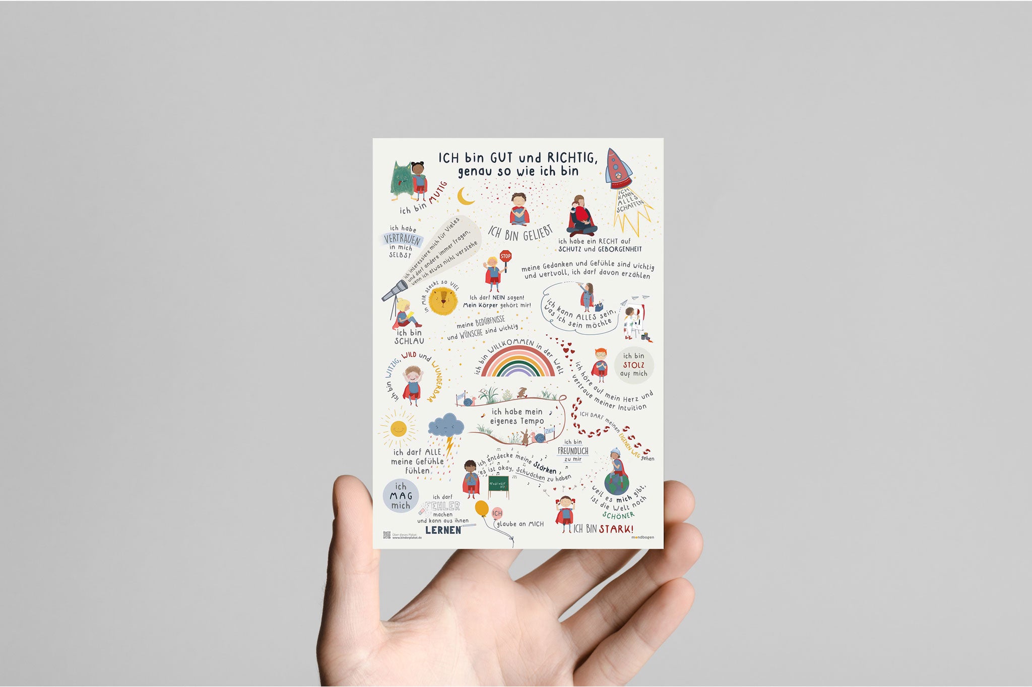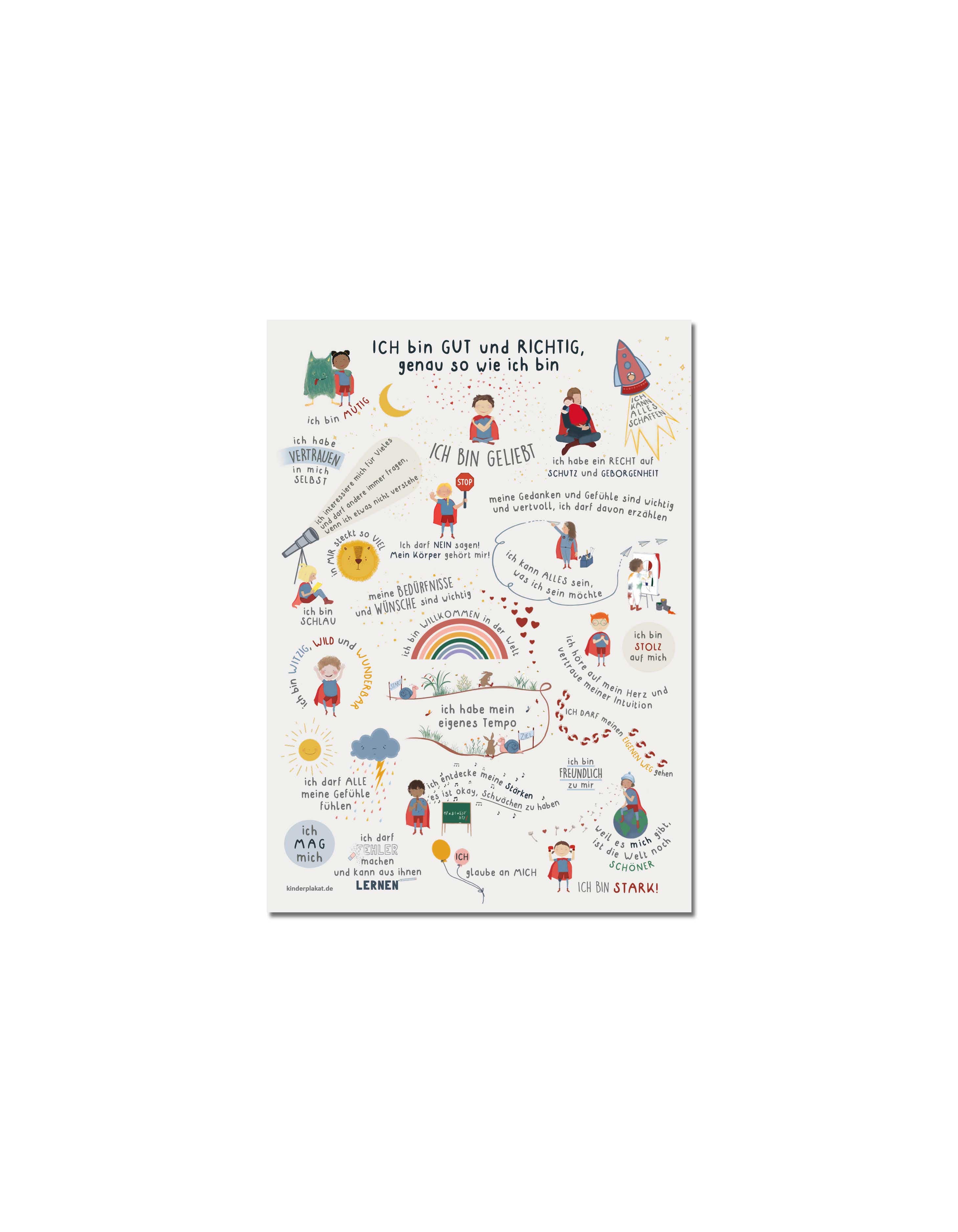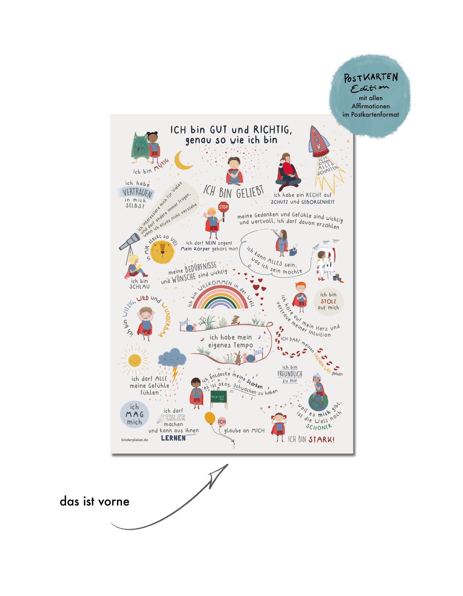 Die Kinder Affirmationspostkarte "Ich bin GUT und RICHTIG, genau so wie ich bin" ist eine Miniaturversion unseres großen Affirmationsposters.