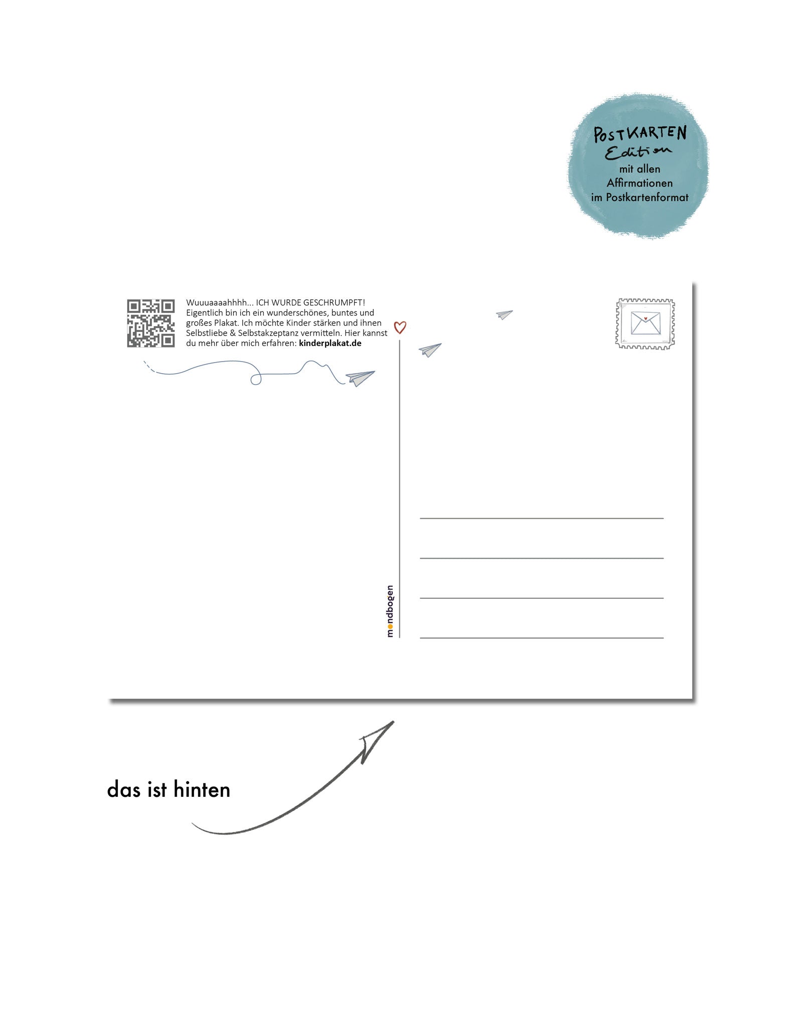 Das handliche Postkartenformat bietet vielfältige Einsatzmöglichkeiten: Als kleine Aufmerksamkeit in Beratungsstellen, Kinderarztpraxen, als wertschätzende Geste in Schule oder Kindergarten und für alle anderen Institutionen, in denen Kinder ein- und ausgehen. Oder um einfach mal wieder jemandem einen netten Gruß in den Briefkasten zu senden. So kann man auf einfache Art und Weise Kindern positiven Zuspruch mit auf den Weg geben, um die innere Stimme von Kindern zu stärken.