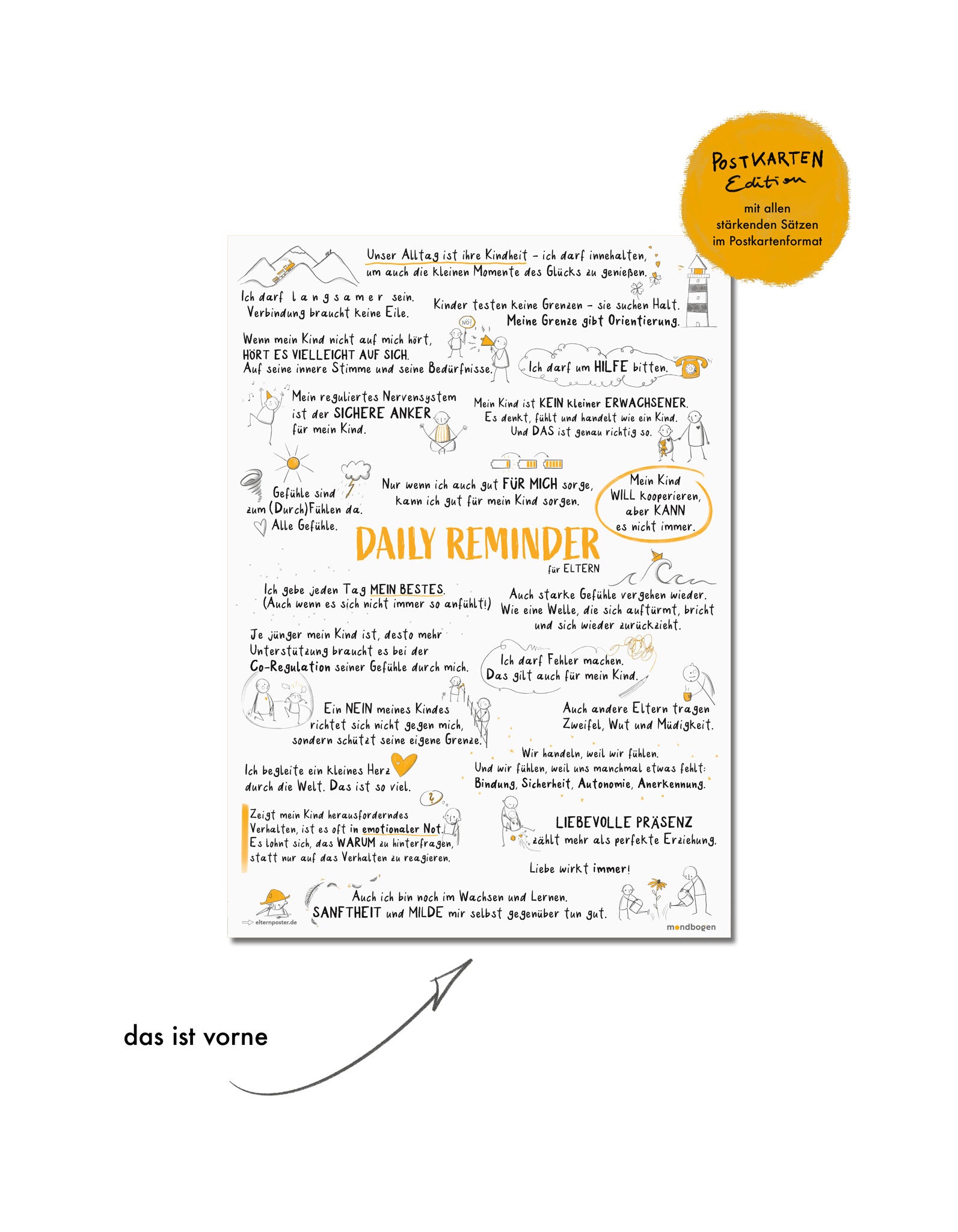 Tipp: Passend dazu gibt es unseren Daily Reminder für Eltern auch als großes Elternposter. Für Einrichtungen und Gruppen eignen sich Sets & Klassensätze (siehe Kategorie „Sets & Pakete“).
